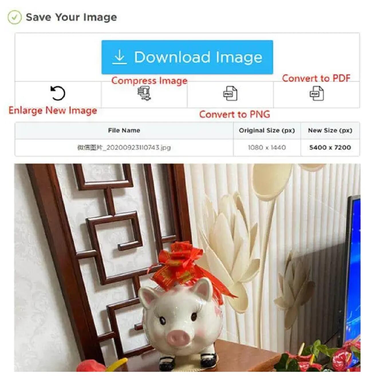 Bevor Sie auf die Schaltfläche "Bild herunterladen" klicken, können Sie zurückkehren, um ein neues Bild zu vergrößern, ein Bild zu komprimieren, in PNG und in PDF zu konvertieren.