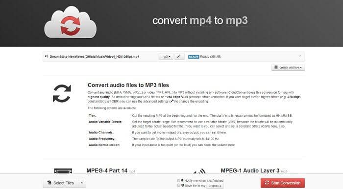 Cloud Converts Slogan ist, dass es alles in alles konvertieren kann, daher funktioniert MP3 natürlich auch. Die Website ist etwas einfacher zu verstehen als die Erste, und mehr Optionen zum Anpassen der Datei.