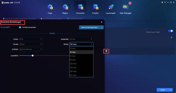 Wir starten mit den Videokonvertierung. Wenn Sie danach suchen, gibt es kein besseres Tool als den DVDFab Video Converter. Die Software unterstützt fast jedes Videoformat der Welt und kann daher wirklich allesmögliche in MP3 konvertieren. Man kann auch eine Video-zu-Video Konvertierung durchführen oder Videos in andere Audioformate wie FLAC, WAV oder AAC konvertieren. Außerdem kann man mit dem DVDFab Video Converter den Codec Typ, die Sample Rate, Kanäle, Lautstärke und vieles mehr verändern. Und so geht dieser MP3 Converter: