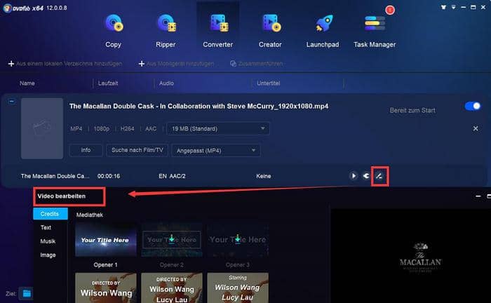 Schritt 4: Nun können Sie den Videonamen ändern und auf das „Schraubenschlüssel“ Symbol klicken, um Einstellungen vorzunehmen.