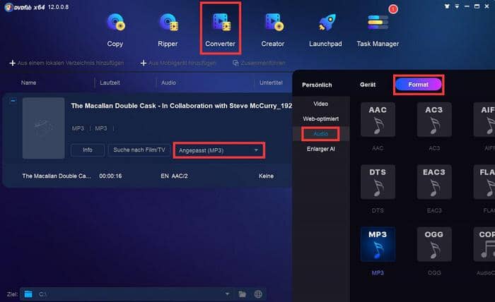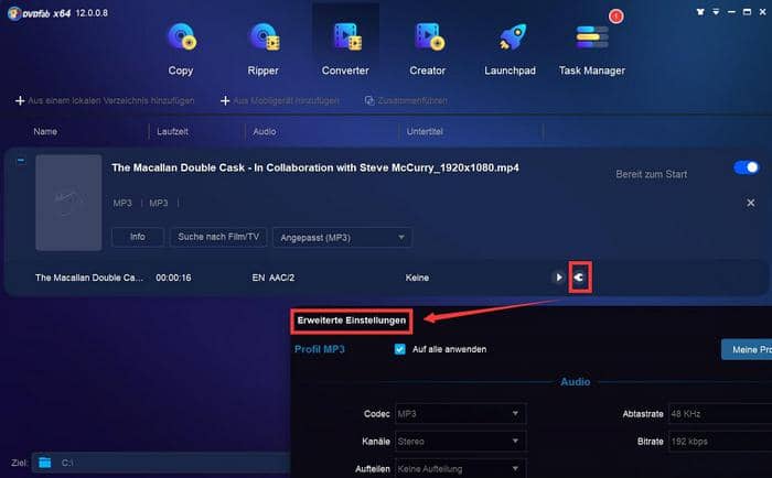 Der DVDFab Video Converter ist der beste YouTube zu MP3 Converter, mit dem Sie YouTube Videos in MP3 Audioformat auf Windows oder Mac konvertieren können. Es gibt keine Begrenzung in der Dateigröße, sodass Sie riesige Videodateien konvertieren können. Der DVDFab Video Converter hat einen eingebauten Editor, mit dem Sie das Video vorab einsehen können und das Video (Audio) trimmen können. Man kann außerdem die Audioparameter wie Codec, Sample Rate, Bitrate etc. festlegen.