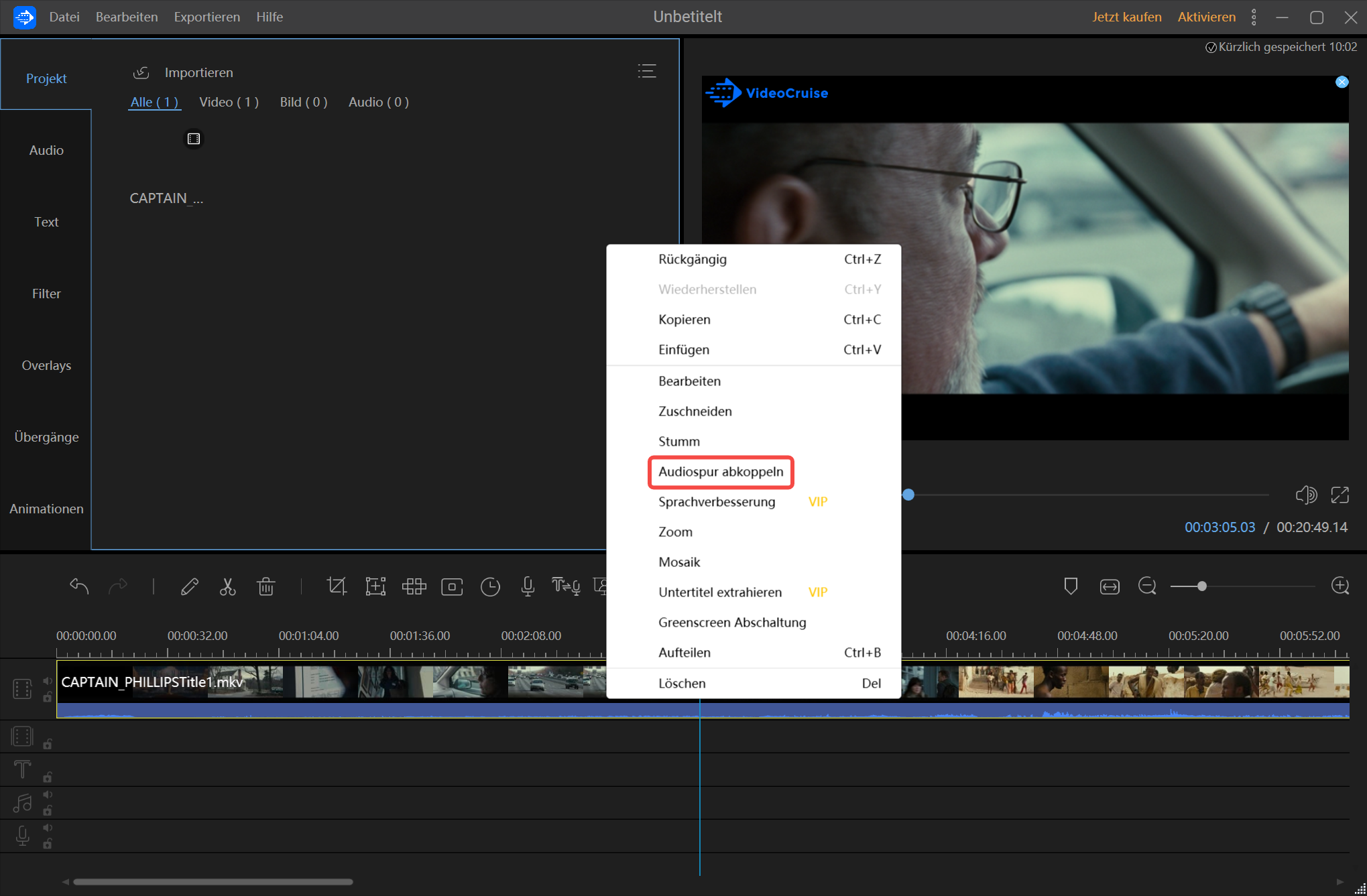 • Klicken Sie auf „Audiospur abkoppeln“ und schalten Sie Ihr Video stumm