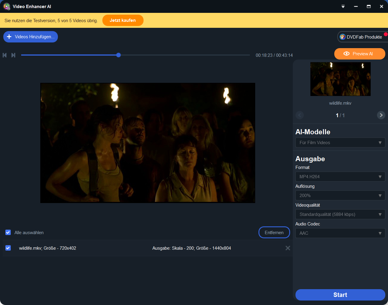Klicken Sie nach allen Einstellungen auf die Schaltfläche „Start“ und warten Sie, bis DVDFab Video Enhancer AI das Rauschen aus Ihrer Datei entfernt hat. Innerhalb kurzer Zeit wird die Rauschunterdrückung durch diese Software abgeschlossen. So können Sie mit dem besten kostenlosen Tool Rauschen aus Video problemlos entfernen.