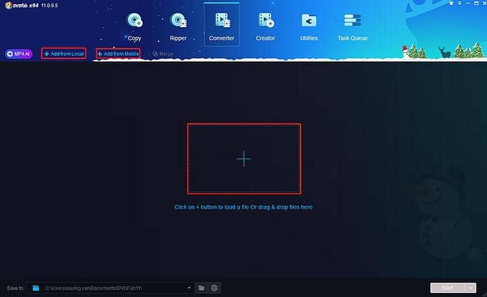 Hier können Sie die Videoquelle via „+Von Lokal Hinzufügen“, „+Von Mobil Hinzufügen“ laden oder ganz einfach das Video in den „+“ Bereich der Oberfläche ziehen. Hier müssen Sie als nächstes „DVDFab Remote“ unter dem Bereich „Freeware“ herunterladen, welches Sie auf der offiziellen DVDFab Webseite oder im Google Play Store finden können. Stellen Sie außerdem sicher, dass Ihr mobiles Gerät die gleiche Internetverbindung wie der PC nutzt. So können Sie Ihre Dateien zwischen Mobil und PC übertragen.