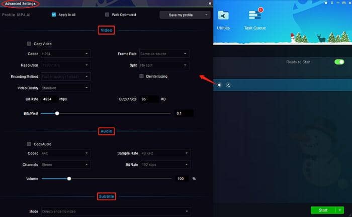 Zunächst gehen Sie auf die “Erweiterten Einstellungen” (das Schraubenschlüssel Symbol) und legen die Parameter wie „Video“, „Audio“ und „Untertitel“ fest. Beim Video können Sie die Bildrate, Bitrate oder Ausgabegröße anpassen. Sie können die Ausgabe Videogröße komprimieren, wenn Sie möchten. Sie können einen Haken bei “Video kopieren” setzen, was bedeutet, dass das ausgegebene Video eine genaue Kopie des Originals ist. Um die Videoauflösung hochzustufen zu können, wählen Sie diese Option.